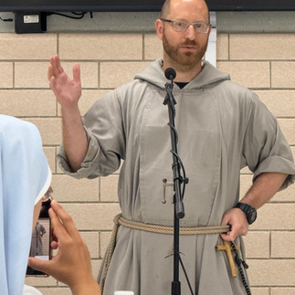 After Mass, there was a breakfast reception in the parish hall, during which all of those on pilgrimage — the six young adult lay people, the priest chaplain, the two members of the Franciscan Friars of the Renewal, the four Daughters of Mary, Mother of Healing Love, and two lay women accompanying the pilgrims all 65 days in the "caravan" — gave brief witnesses of what have been the highlights of the pilgrimage over the first 65 days.