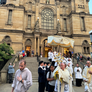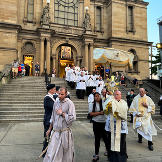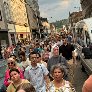 After the conference, the Pilgrims transported the Lord to the location where an evening procession would begin at 7 pm, led by Bishop Bradley. The Blessed Sacrament was carried on a float during the procession, in which several hundred faithful participated. The procession ended at the beautiful St. Peter's Church in Steubenville, which, though large, was standing room only with many people seating in the aisles.