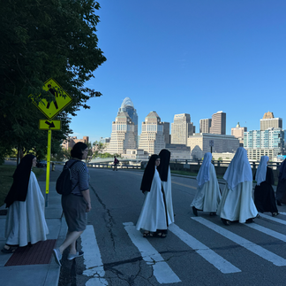 After Lauds, Seton Route chaplain Father Roger brought the Blessed Sacrament to the Pilgrims' support van for a 20 minute journey to Holy Cross-Immaculata Church in the Mount Adams part of Cincinnati, overlooking the Ohio River. There more than 200 pilgrims had a half-hour of Eucharistic adoration before beginning a beautiful morning Eucharistic procession downhill to the Cathedral Basilica of St. Peter's in Chains in downtown Cincinnati.