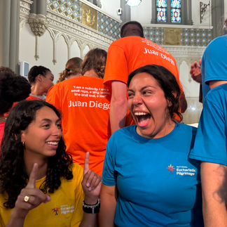 INDIANAPOLIS, July 16 — The Seton PIlgrims of the National Eucharistic Pilgrimage completed the physical part of their journey from New Haven, Connecticut to Indianapolis, with a huge Mass celebrated with pilgrims from the Serra (western), Juan Diego (southern) and Marian (northern) Routes at St. John the Evangelist Church in downtown Indianapolis. The Mass was celebrated by Archbishop Charles Taylor of Indianapolis, concelebrated by Cardinal Luis Antonio Tagle, Bishop Andrew Cozzens, Bishop Gerardo Colacicco and a few dozen priests.
