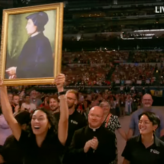 INDIANAPOLIS, July 17 — The 61st day of the Seton Route of the National Eucharistic Pilgrimage featured a jubilant entrance into Lucas OIl Stadium at the beginning of the Tenth National Eucharistic Congress.